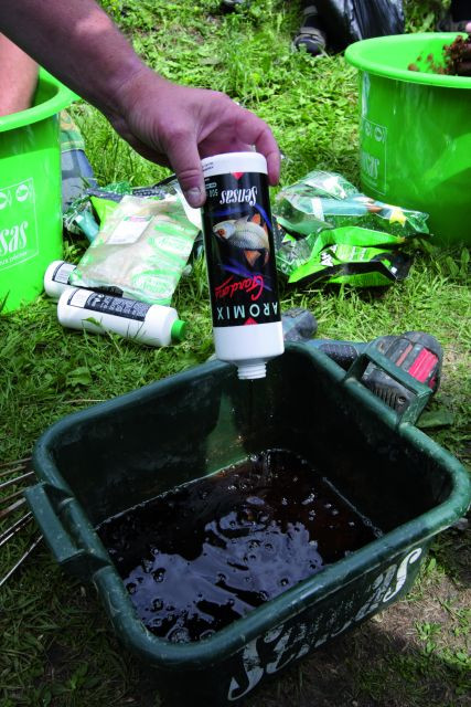 Aromix Flüssigattraktor, der auch ein sehr wirksamer Süßstoff ist, auf den Fische sehr gut reagieren. Er wird dem Wasser zugesetzt, mit dem das Futter angefeuchtet wird, im Verhältnis von 10–25% der gesamten Wassermenge. Wir empfehlen, 125 ml Flüssigattraktor auf 4 kg Trockenmischung zu verwenden.