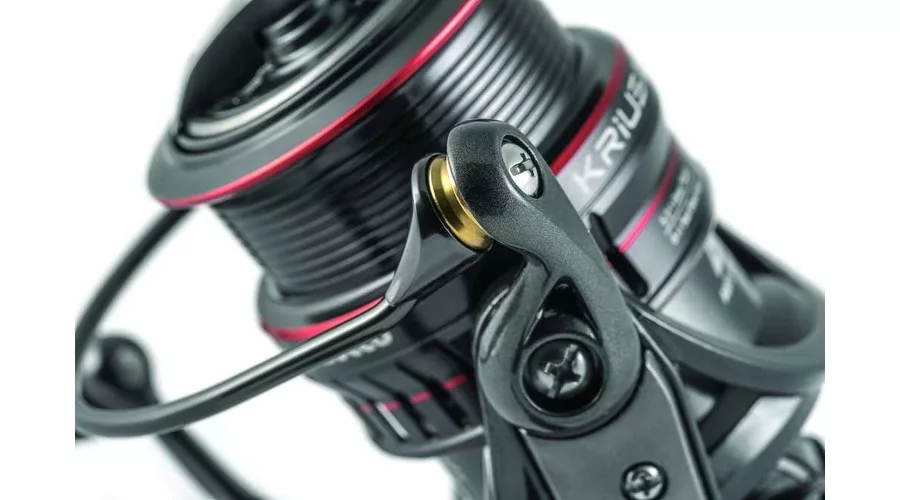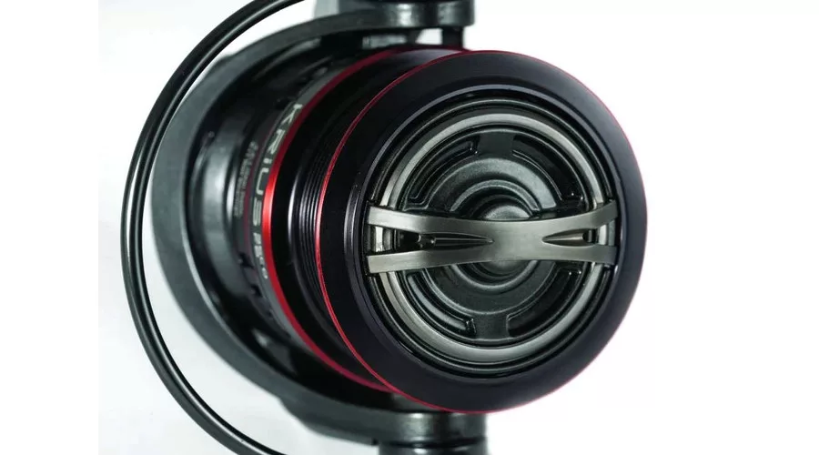 Das überdimensionierte Lamellenbremssystem ermöglicht eine sehr feine Bremseinstellung. Großer Schnurfangbügel mit Titanium-Schnurführungsrolle, die das Verdrehen der Schnur verhindert, sowie ein CNC-gefertigter Kurbelarm mit komfortablem Griff.