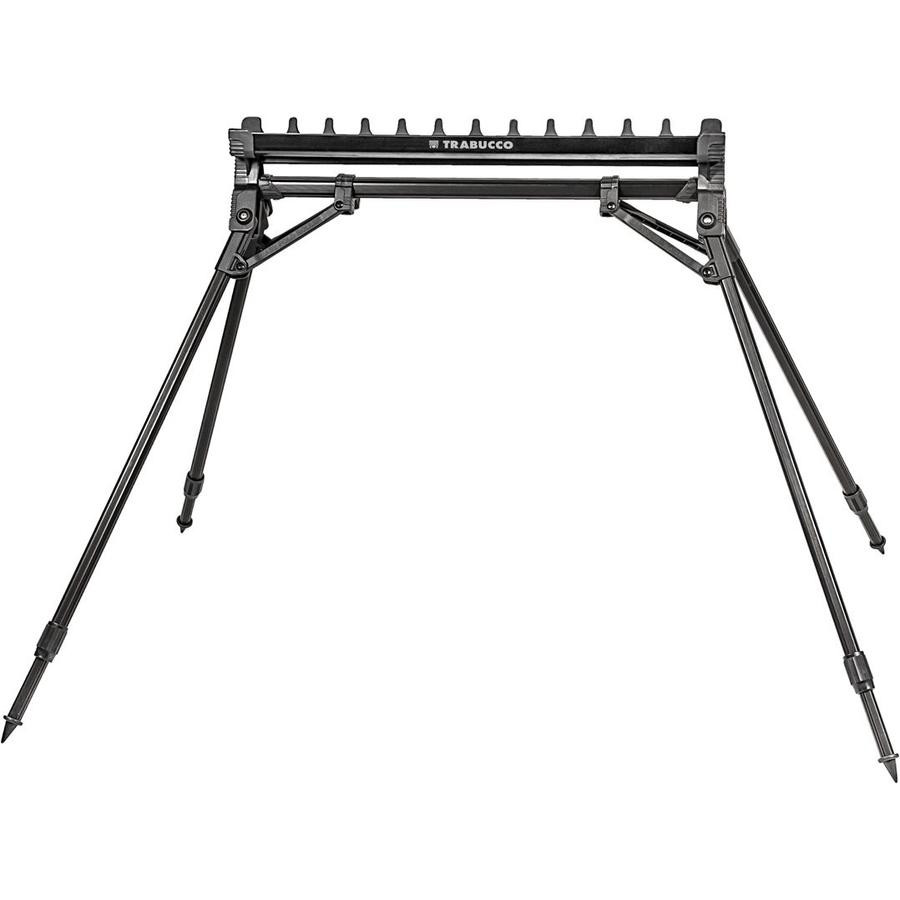 Hochwertiger Rutenhalter mit Aluminiumrahmen, der dank der Möglichkeit, zwei Beine mit einer Bewegung gleichzeitig zu bewegen, im Handumdrehen auf- und abgebaut werden kann. Mit den Teleskopbeinen ist die Positionierung auch unter schwierigsten Geländebedingungen kein Problem. Er bietet Platz für 12 Ruten. Die mit der Rute in Berührung kommenden Teile sind mit EVA überzogen.