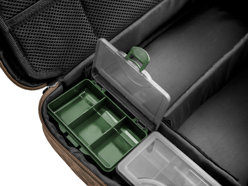 Das Hauptfach bietet ausreichend Platz für Kleinteile, Vorfachschnüre und die notwendigen Werkzeuge zur Herstellung Ihrer Montagen. Außerdem gibt es vier Boxen, in denen die Kleinteile Platz finden. Auf der einen Seite des mittleren Teils befinden sich kleinere Netztaschen, während sich auf der anderen Seite eine große Netztasche befindet. Dadurch sehen Sie immer genau, wo sich was befindet, und haben leichten Zugriff. Die RigStation verfügt über zwei Schaumstoffwände, an denen Sie Ihre vorgebundenen Haken befestigen können. Der Tragegriff befindet sich am oberen Teil der Tasche, sodass sie beim Tragen nicht umkippt und Ihre Ausrüstung immer an ihrem Platz bleibt. Sie ist mit einem hochwertigen Reißverschluss und einem Kunststoffschieber ausgestattet. Die RigStation erweitert die CARPATH-Serie mit Fischmuster.