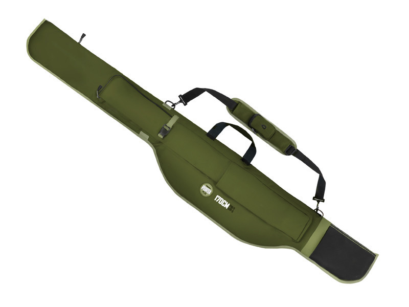 Das Rutenfutteral ist grün mit schwarzen Accessoires, aus einem sehr widerstandsfähigen Material gefertigt, das problemlos kleinerem Regen oder Feuchtigkeit durch Tau standhält. Der untere Teil besteht aus widerstandsfähigem, wasserdichtem Material, so dass es ohne Probleme auf nassen Boden gestellt werden kann. Alle Seiten des Rutenfutterals sind mit einer 6 mm dicken, weichen Polsterung versehen, auch die Trennwand. So können auch beim Transport von zwei Ruten keine Schäden entstehen. Beide Fächer können oben mit Klettverschluss befestigt werden. Der Rollenbereich ist verbreitert, damit die Karpfenausrüstung gut hineinpasst, wobei auch an den 50 mm Startring gedacht wurde.