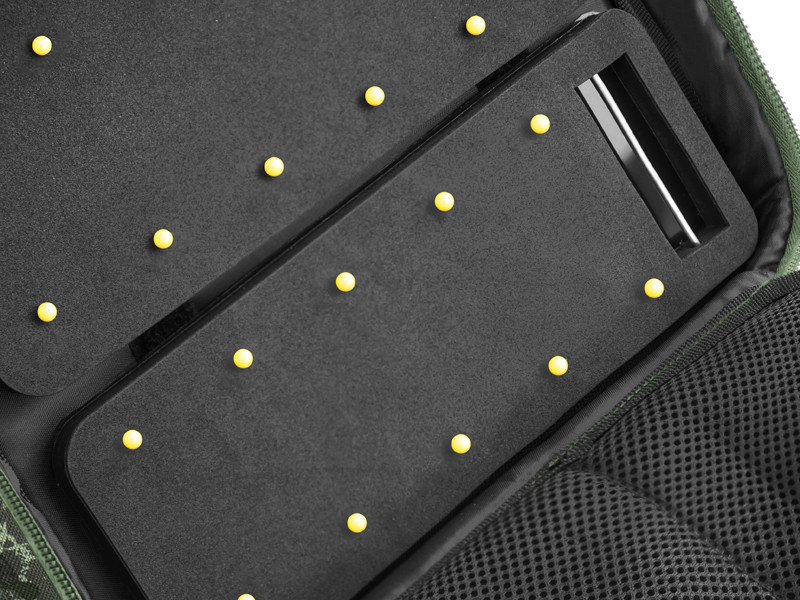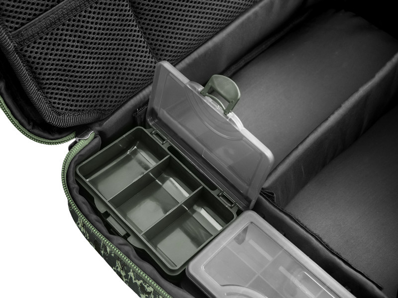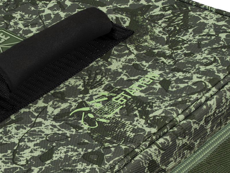 Das Hauptfach bietet reichlich Platz für Kleinteile, Vorfachschnüre und die notwendigen Werkzeuge, um Ihr Rig zu bauen. Darüber hinaus gibt es vier Boxen, in denen die Kleinteile Platz finden. Die mittlere Sektion hat auf der einen Seite kleinere Netztaschen, auf der anderen eine große Netztasche. Dadurch haben Sie immer einen guten Überblick darüber, wo sich was befindet, und können leicht darauf zugreifen. Die RigStation verfügt über zwei Schaumstoffwände, an denen Sie Ihre vorgebundenen Haken befestigen können. Der Tragegriff befindet sich oben an der Tasche, sodass sie beim Tragen nicht umkippt und Ihre Ausrüstung immer an ihrem Platz bleibt. Sie ist mit einem hochwertigen Reißverschluss und einem Kunststoffzug ausgestattet.