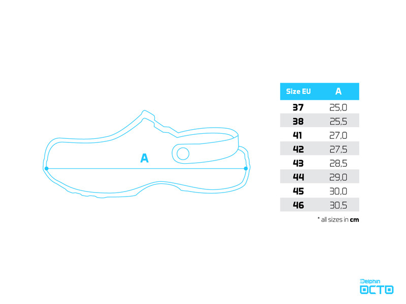Die Geschichte hinter dem Namen OCTO ist äußerst interessant. Wir haben sie mit der stilisierten Form von Oktopus-Tentakeln entworfen, die unter allen Bedingungen hervorragenden Halt bieten. Der Oktopus ist im Englischen 'OCTOpus' und im Lateinischen 'OCTOpoda'. Diese beiden Wörter inspirierten das Design und die Namensgebung, die wir kurz als OCTO festgehalten haben. Ein weiteres raffiniertes Detail sind die großen seitlichen Öffnungen, die primär der Belüftung dienen. Sie sind bewusst nicht auf Sohlenhöhe platziert, wie es normalerweise üblich ist, sondern etwas höher. Dies ist wichtig, da es verhindert, dass Sand oder Kieselsteine leicht zwischen die Badeschuhe und die Sohle gelangen, besonders wenn Sie sich am Ufer oder in flachem Wasser aufhalten. So können sich Ihre Füße maximal geschützt fühlen. Zudem trägt die dichte Perforation im unteren Bereich zur Belüftung bei. Auf der einen Seite haben wir das D-Symbol aus dem Delphin-Logo verwendet, auf der anderen Seite den Buchstaben O, der der Anfangsbuchstabe des Namens OCTO ist. Die feine Textur auf der Sohlenoberfläche, die an die Haut eines Tintenfischs erinnert, verstärkt den Gesamteindruck zusätzlich. Dank des EVA-Materials sind die Badeschuhe extrem leicht, strapazierfähig und schwimmfähig. Selbstverständlich gehört zu diesem Modell auch ein Fersenriemen, der hilft, den Fuß zu fixieren, insbesondere bei der Verwendung auf unebenem oder abschüssigem Gelände.