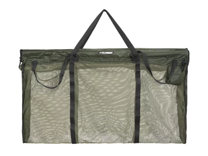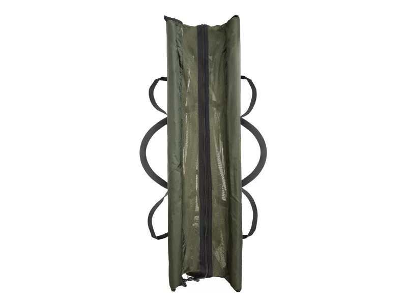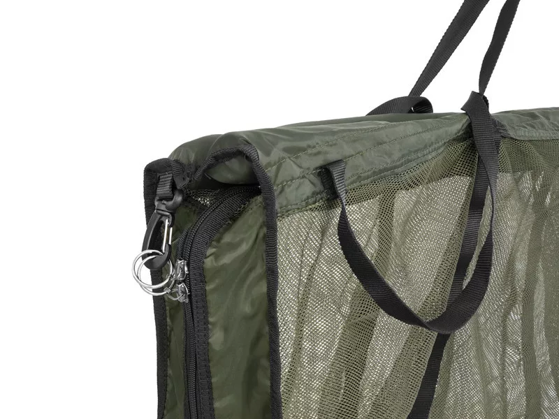 Das Netz wird durch zwei schwarze Textilriemen verstärkt, die sich zu einem zentralen Griff verbinden. Dank der langen Laschen lässt sich die Tasche leicht an eine Waage hängen. Die Tasche hat an beiden Seiten Textilgriffe zum einfachen Heben und Transportieren. Auf beiden Seiten und oben befindet sich ein starker Reißverschluss, so dass die CWS vollständig geöffnet werden kann, um die Handhabung der Fische zu erleichtern.