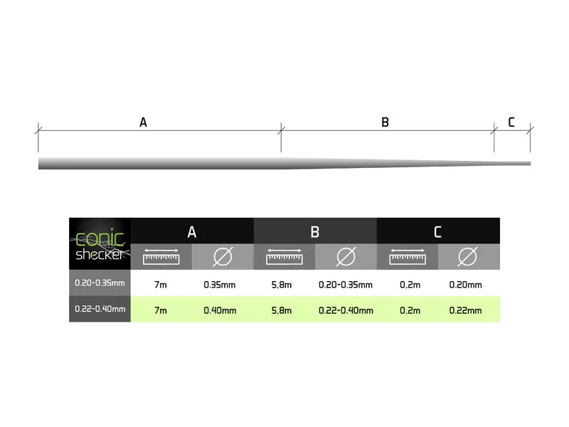 Das Wesen des konisch zulaufenden Vorfachs liegt im stufenweise wechselnden Durchmesser, wodurch es mit einem sehr kleinen Knoten an der Hauptschnur befestigt werden kann. Dies ist ein Schlüsselparameter für ein viel leichteres Abrollen der Schnur von der Rolle und einen nahtlosen Übergang durch die Ringe.