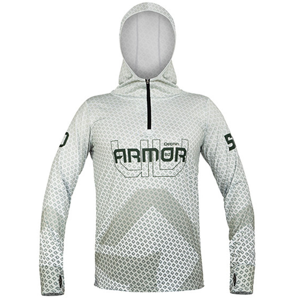 Das Delphin UV Armor 50+ Neon Kapuzen-Langarmshirt bietet perfekten Schutz vor der Sonne an Sommertagen. Das Material mit UPF 50+ Schutz bewahrt Ihre Haut vor Sonnenbrand, und sein Gefühl ist selbst an den heißesten Tagen kühl. Da unser Kopf sehr schnell überhitzen kann, verfügt das Oberteil über einen hohen Kragen und eine Kapuze. Außerdem sind die Ärmel extra lang und haben Daumenschlaufen, um auch Ihre Hände zu schützen. Es besteht aus weichem, elastischem Material, das schnell trocknet, falls es beim Angeln nass wird. Sowohl das Oberteil als auch der Aufdruck darauf sind von ausgezeichneter Qualität. Material: 90% Polyester, 10% Elasthan.