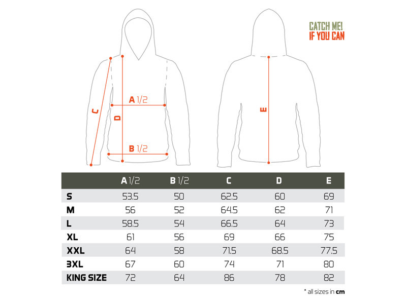 Die CATCH ME IF YOU CAN Serie mit Karpfen-Design ist nicht nur ein herausragendes Stück in Anglerschränken. Das Karpfenmotiv umgibt den unteren Teil des Rumpfes, erscheint als Skizze oder Gemälde, während alle wesentlichen Details erhalten bleiben. Der Fisch nähert sich gerade einer Handvoll Boilies – das ist genau der Moment, auf den Angler warten. Der Kapuzenpullover ist dunkelgrün mit auffälliger orangefarbener und hellgrüner Grafik.