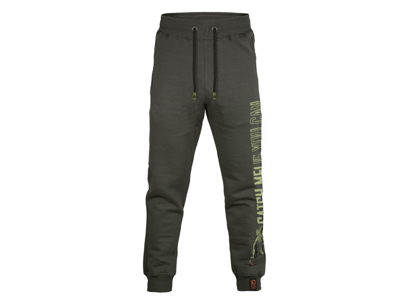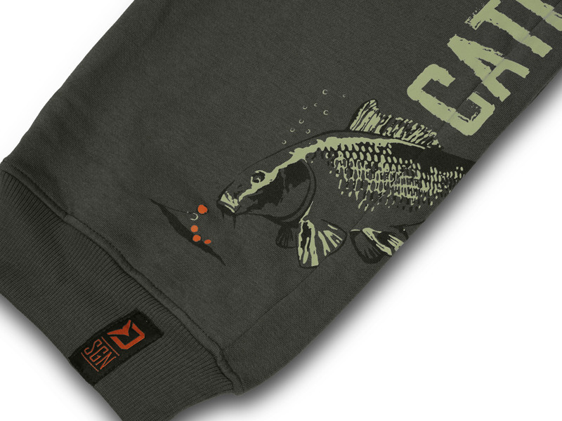Die Catch me CARP NX Jogginghose ist auf der linken Seite mit einer auffälligen Grafik verziert, auf der der Text "CATCH ME IF YOU CAN" zu lesen ist und unten ein fressender Karpfen abgebildet ist. In Kombination mit dem passenden Kapuzenpullover und T-Shirt ergibt sich ein stilvolles Outfit, in dem Sie sich am Wasser außergewöhnlich wohlfühlen werden.