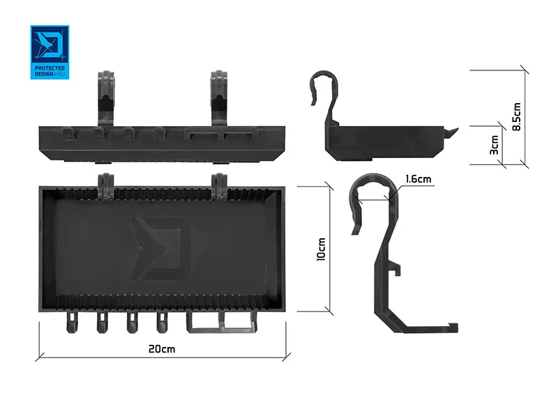An der Vorderseite der Ablage befinden sich Haken zum Aufhängen von Rigs. Diese können zur Aufbewahrung von Nadeln, Scheren oder anderen kleinen Teilen verwendet werden. Die herausnehmbaren Trennwände ermöglichen eine individuelle Anpassung des Stauraums an Ihre Bedürfnisse. Die Ablage ist im beliebten schwarzen BlackWAY-Design gefertigt und passt sehr gut zu unseren Rutenhaltern.