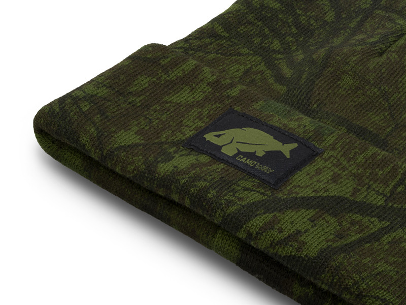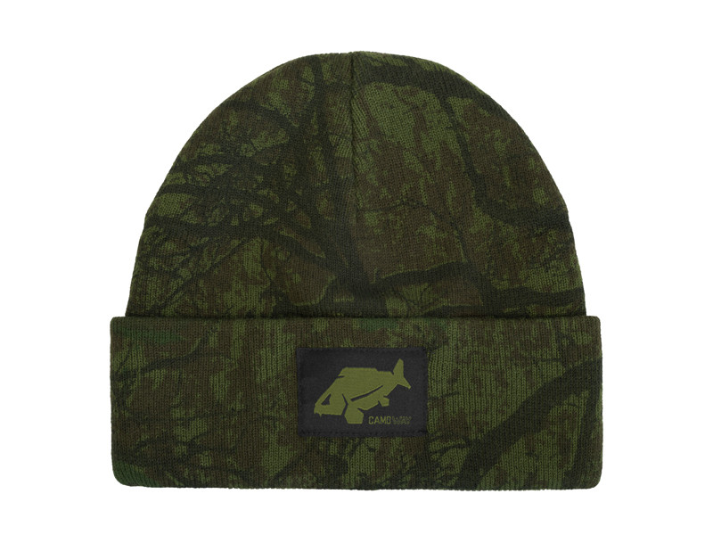 Stilvolle Tarnmütze, verziert mit kleinen Herbstbaum-Motiven und einem originellen OutLINE Karpfen-Design.