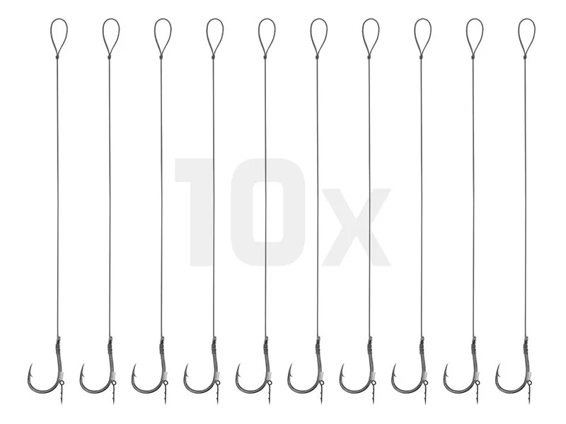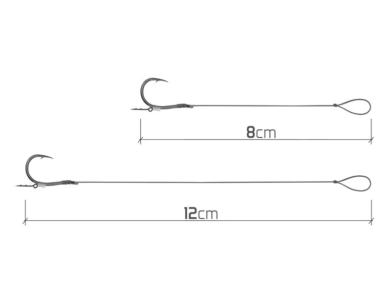 Die technische Konstruktion des Produkts umfasst ein 8 Zentimeter langes Vorfach aus feiner geflochtener Schnur, an dem ein Chinu-Haken der Größe 4 befestigt ist. Die Verpackung enthält 10 vollständig angelfertige Montagen, von denen jede mit einem praktischen Köderbefestigungsdorn ausgestattet ist. Diese Lösung ermöglicht eine schnelle und stabile Befestigung verschiedener Ködertypen wie schwimmende Pop-up-Boilies, Wafter oder Pelletköder, wodurch der Beköderungsprozess einfach und effizient wird.