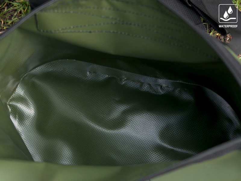 Das dunkelgrüne Design wird durch dezente schwarze Grafiken und das originelle OutLINE Karpfen-Logo abgerundet.