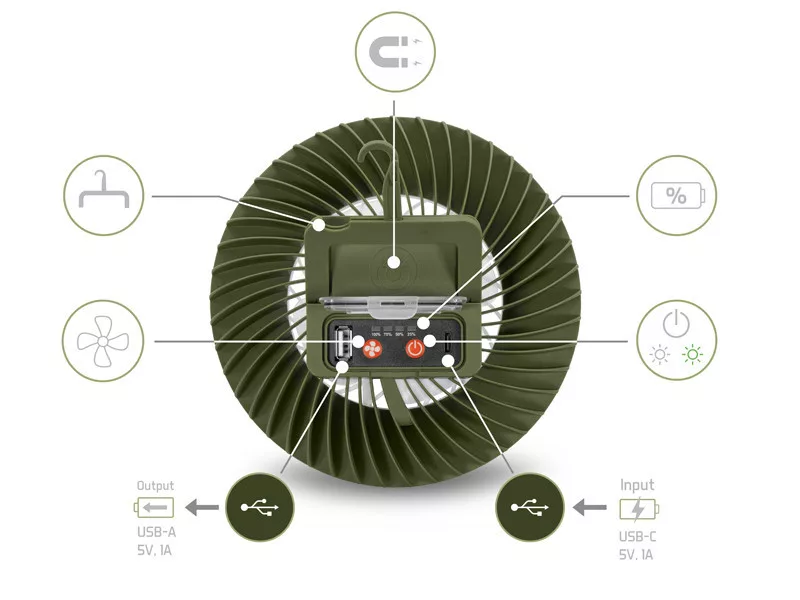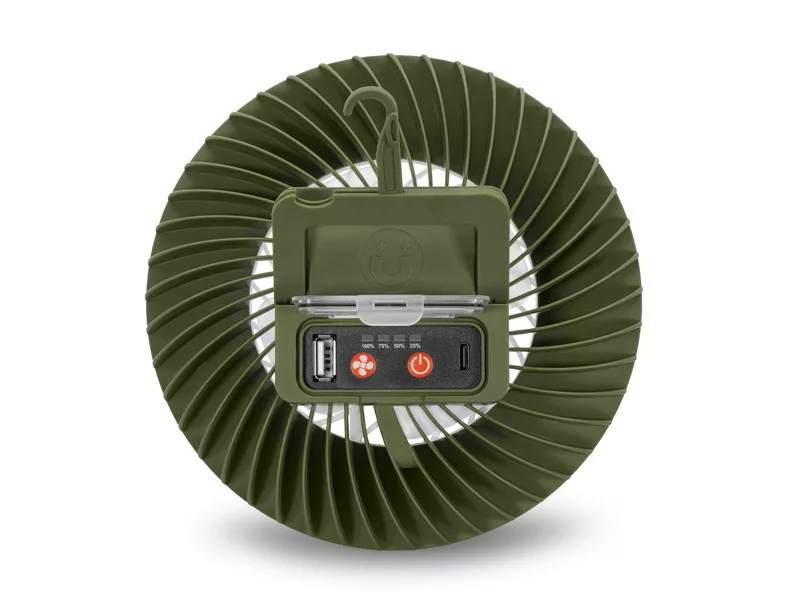 Die LED-Beleuchtung kann in drei Modi verwendet werden: 100 % weißes Licht (350 Lumen) leuchtet bis zu 7 Stunden, während bei 50 % Helligkeit (180 Lumen) die Betriebsdauer auf 14 Stunden ansteigt. Zudem ist ein Grünlicht-Modus verfügbar, der bei voller Helligkeit etwa 10 Stunden lang funktioniert. Der Ventilator ist ebenfalls in drei Stufen einstellbar: Auf niedriger Stufe kann er bis zu 19 Stunden betrieben werden, auf mittlerer Stufe 14 Stunden und auf der höchsten Stufe etwa 11 Stunden.