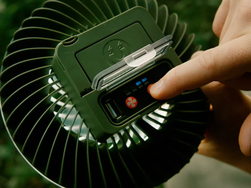 Der USB-C-Anschluss auf der Rückseite des Geräts dient zum Laden, während der USB-A-Anschluss die Verwendung als Powerbank ermöglicht – zum Beispiel zum Laden von Telefonen oder Stirnlampen. Der Ladezustand wird durch eine LED-Anzeige angezeigt, die sich ebenfalls unter der wasserdichten Abdeckung befindet und somit vor Witterungseinflüssen geschützt ist.