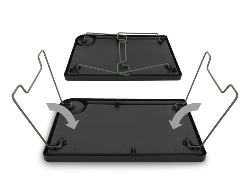 Das Beinsystem ist zusammenklappbar und die stabilen Befestigungsklammern halten den Tisch sowohl während des Gebrauchs als auch beim Transport zuverlässig. Im zusammengeklappten Zustand ist er extrem flach (nur 7 cm dick) und passt somit problemlos in kleine Räume, sei es beim Angeln mit dem Auto oder im Zelt.