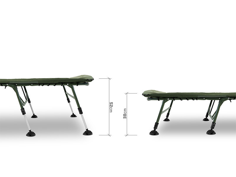 Das Delphin ErgoCARP Angelbett stellt eine neue Ebene der Entspannung am Wasser dar, wo Komfort, Stabilität und Langlebigkeit aufeinandertreffen. Die vergrößerte Matratzengröße (215 × 80 cm) bietet auch für größere Angler ausreichend Platz, während die Grundhöhe von 38 cm und die Teleskopbeine bis zu 52 cm verstellbar sind, sodass das Bett in jedem Gelände stabil platziert werden kann. Die acht unabhängig voneinander verstellbaren Beine sind mit breiten, flexiblen Füßen ausgestattet, die ein Einsinken auf weichem Untergrund verhindern und Stabilität auf unebenem Gelände gewährleisten.