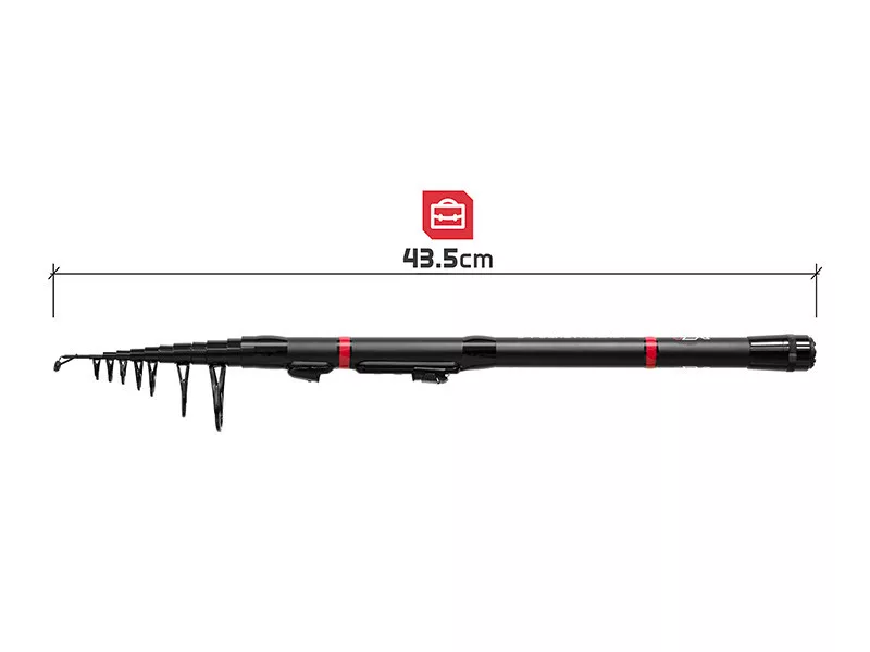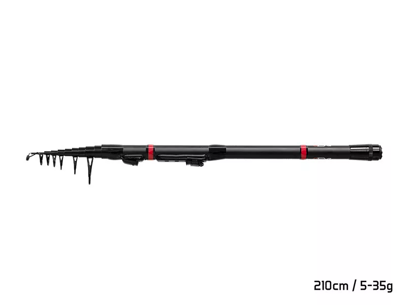 Das Grundmaterial der Rute ist ein extrem schlanker, aber zäher 24T Carbon-Blank, der die negativen Stereotypen im Zusammenhang mit Teleskopsystemen widerlegt. Dieses moderne Verbundmaterial verleiht der Rute eine hervorragende Aktion, sodass sie während des Drills jeden Hauch überträgt und gleichzeitig über genügend Kraftreserven für den Umgang mit unerwartet großen Fischen verfügt. Die Länge von 2,10 Metern wird mit einem Wurfgewicht von 5–35 Gramm kombiniert, was die Rute äußerst vielseitig macht: vom leichten Spinnfischen bis hin zu Posenmethoden kann sie für nahezu jede Technik souverän eingesetzt werden.