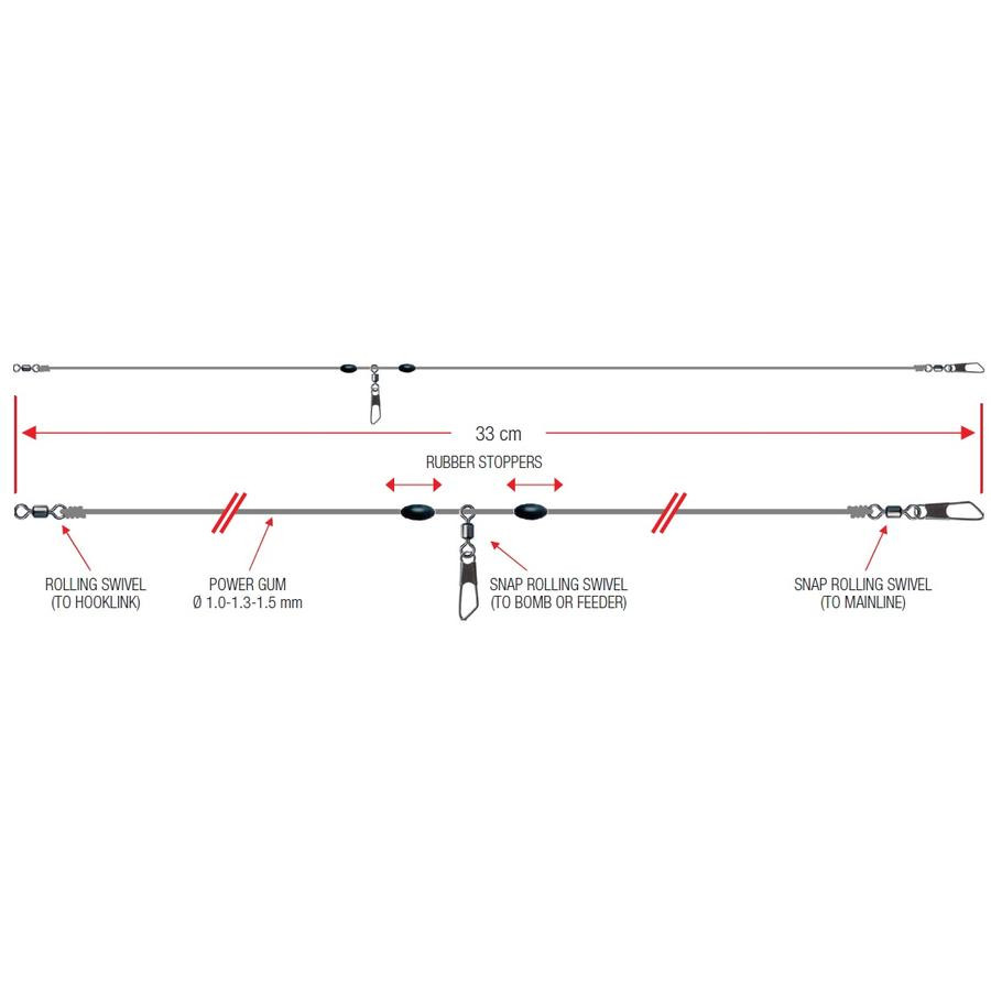 An einem Ende der Montage (Vorfach) befindet sich ein Wirbel, am anderen Ende (Hauptschnur) ein Karabinerwirbel. Die Position des zentralen Karabinerwirbels (Futterkorb) kann mit Hilfe von zwei Gummistoppern positioniert werden. Das Paket enthält zwei Montagen.