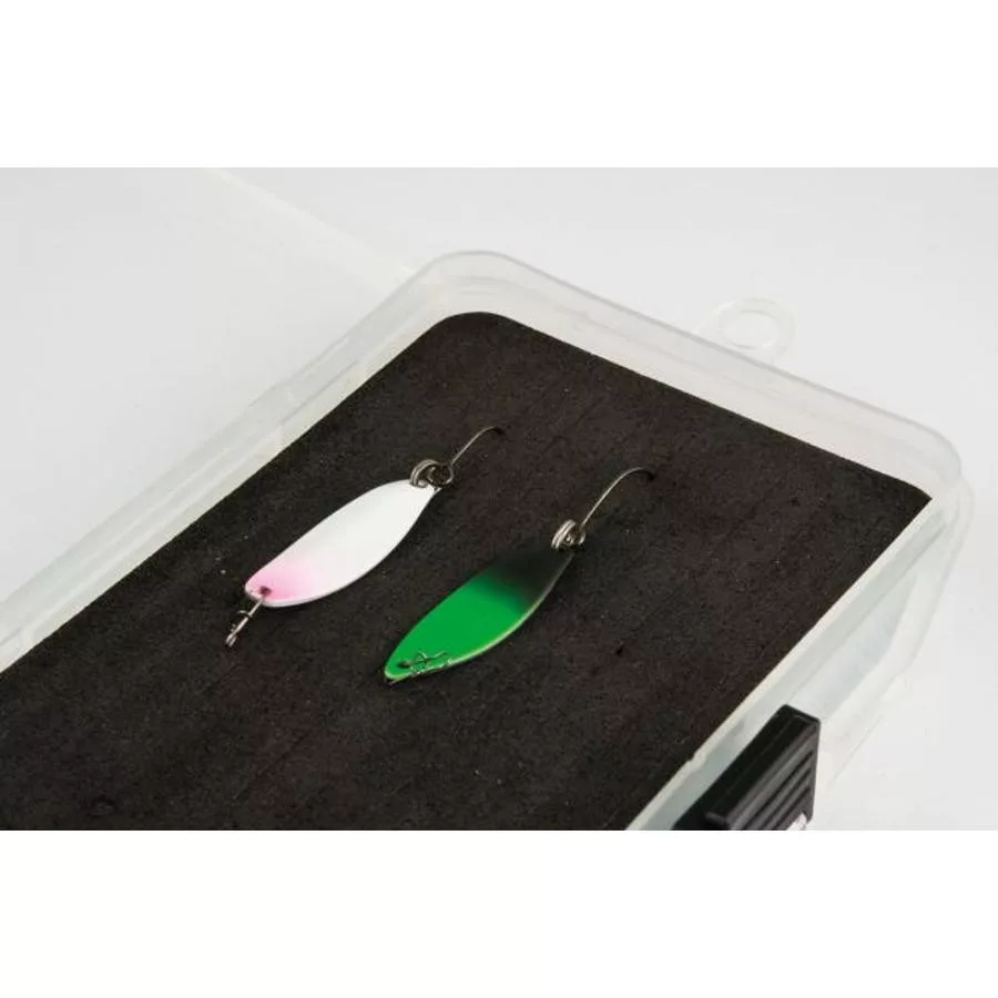 Die Materialwahl ist bei dieser Aufbewahrungsbox entscheidend: Sie ist aus hartem, formstabilem Kunststoff gefertigt, der Langlebigkeit garantiert, während ihr geringes Gewicht die Ausrüstung nicht unnötig belastet. Das transparente Design des Deckels ist eine besonders praktische Lösung, da wir den Inhalt bereits im geschlossenen Zustand sehen können – das spart Zeit und Energie am Wasser, wenn wir schnell den Köder wechseln möchten. Es ist wichtig zu beachten, dass die auf den Bildern gezeigten Kunstköder ausschließlich Illustrationszwecken dienen, die Box selbst ist leer, aber eine ideale Aufbewahrung für jede kleine Köderpackung für feines Gerät.