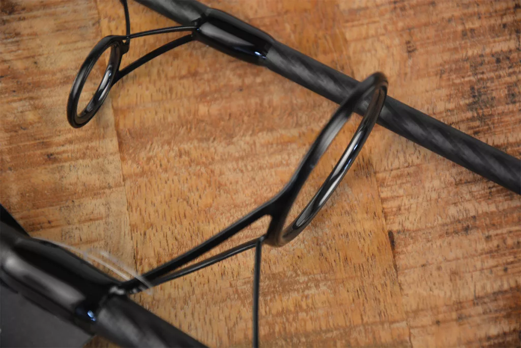» Elegantes Design: Schlichter mattierter Carbon-Blank, mit silbernen Beschriftungen und glänzend schwarzer Wicklung an den Ringen.