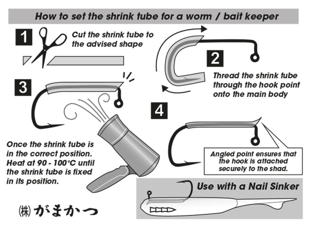 Dieser Haken ist mit einem wärmeschrumpfenden Schlauch ausgestattet, wodurch der Köder fixiert wird und sich nicht bewegen kann, und der Fisch ihn nicht vom Haken ziehen kann.