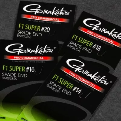 Inhalt der Packung: 1 Packung Gamakatsu Coars Pro-C F1 Super Spade A1 PTFE BL Plattenhaken, widerhakenlos #14.