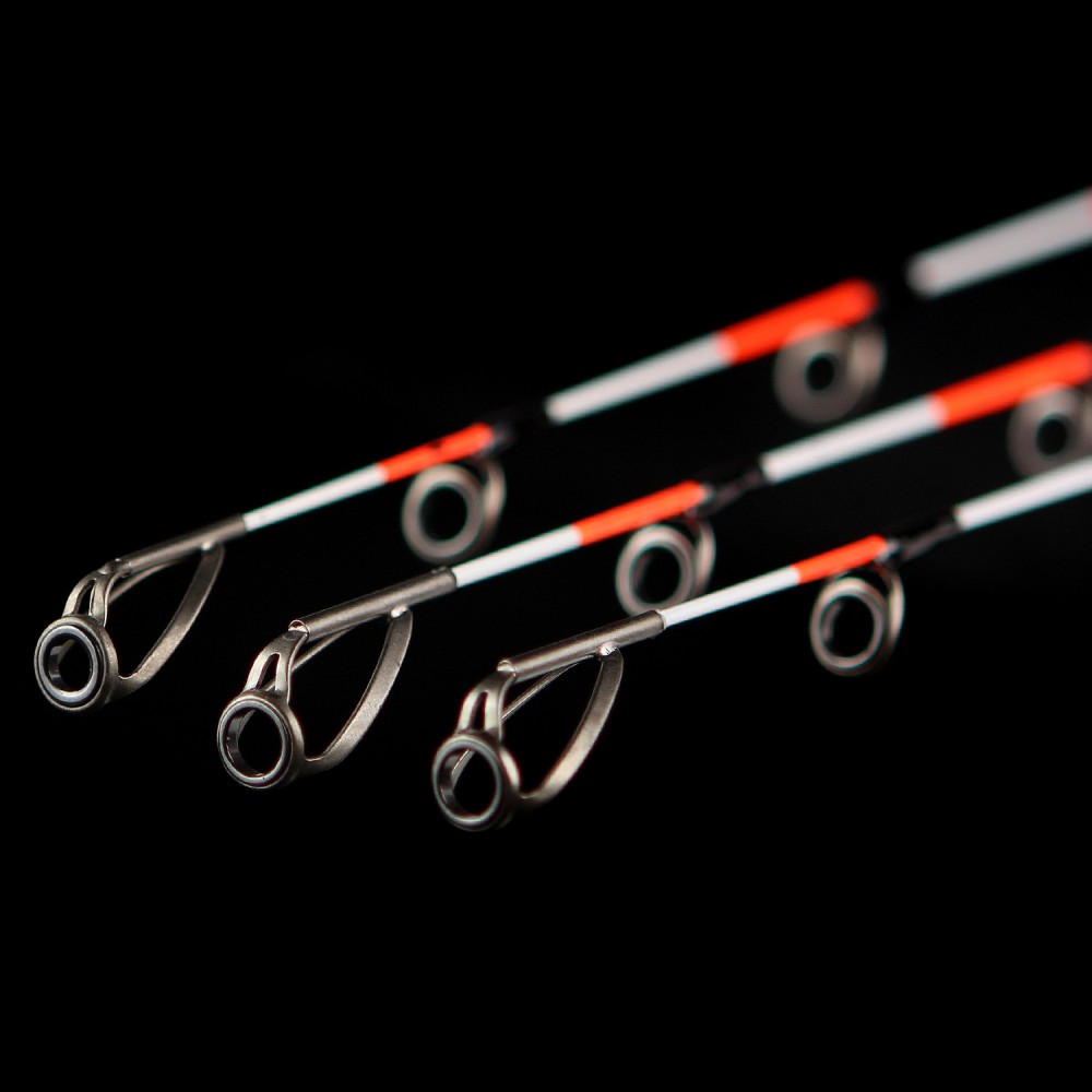 Das Rutenmaterial ist 60TON High Modulus Toray Carbon. Die neue Materialstruktur und hochwertige Verarbeitung sind sehr demonstrativ, strahlen Kraft aus, so dass man glaubt, dass dies tatsächlich in der Lage ist, die Endmontage ins All zu schleudern! Und sie wird beim ersten Wurf nicht in 8 Teile zerbrechen! Die Griffe sind weiterhin geteilt und ausreichend lang, was den nötigen Hebelarm bietet, der unbedingt erforderlich ist, um sich festzuhalten und bei den Würfen mit voller Kraft ziehen zu können! Die extrem harten Seaguide Titanium High Frame Double Foot Beringung ist ziemlich auffällig. Bei den Modellen 395RXH und 430LC sind sie im Vergleich zu früheren Versionen noch größer, und diese Ringtypen sind noch widerstandsfähiger und wurden für noch größere Wurfweiten als ihre Vorgänger optimiert.