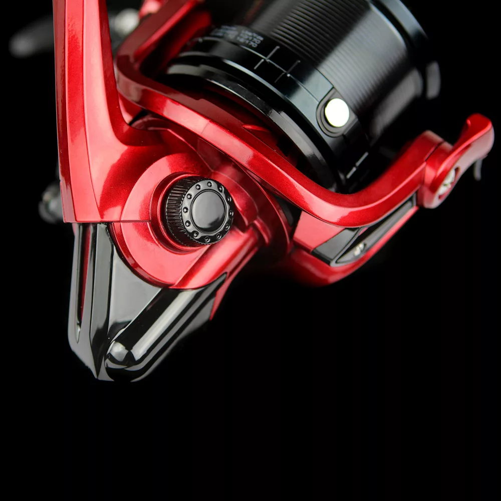 In puncto Aussehen zeichnet sie sich durch ein klares, anspruchsvolles Design aus, elegant und sportlich, in Rot-Schwarz. Die Long Cast ist eine robust gebaute Rolle, die dennoch relativ leicht geblieben ist, selbst die größere Größe wiegt nur 534 Gramm. Eine ihrer Besonderheiten ist die 100% staub- und spritzwassergeschützte Präzisions- Schnellbremse, die sich mit einer halben Umdrehung fast vollständig schließen lässt. Warum ist das nötig? Beim Weitwurf-Angeln kann die Schnur beim dynamischen Wurf rutschen, wenn die Bremse nicht vollständig geschlossen oder stabilisiert wurde, was zu schweren Fingerverletzungen führen kann. Die Wahrscheinlichkeit dafür kann mit einer schnellen Bewegung vollständig ausgeschlossen werden. Die mit Filzlamellen versehene, staubgeschützte Bremse funktioniert natürlich bei jeder Einstellung einwandfrei und dosiert die Schnur fein. Außerdem blockiert die Rotorbremse – die besonders bei Weitwurfrollen wichtig ist – bei geöffnetem Rollenbügel die Drehung des Rotors und verhindert so ein versehentliches Zurückschlagen des Rollenbügels während des Wurfs. Im reduzierten, schlanken, rot-schwarzen Gehäuse befindet sich ein Getriebe mit mittlerer Übersetzung (4,6:1) . Die im Gehäuse verborgenen 6+1 Kugellager sorgen für einen leichten, geschmeidigen Lauf. Für ein präzises Schnurbild ist die super langsame (die Spule bewegt sich einmal hoch und wieder runter in die Ausgangsposition bei 9 Kurbelumdrehungen) Schneckenwellen-Spulenhub verantwortlich. Ihre große (69 mm) Aluminium-Weitwurfspule ermöglicht nicht nur einen schnellen Schnureinzug, sondern mit der neu entwickelten Weitwurf-Abwurfkante gleitet die Schnur schnell und mit wesentlich geringerem Widerstand ab. Eine gemeinsame Eigenschaft von Stationärrollen ist, dass sich die Schnur bei unachtsamer Benutzung unter die Spule wickeln kann. Um dies zu verhindern, befindet sich unter der Spule ein „Verwicklungs-Schutzrahmen“ auf der Achse, der praktisch unsichtbar ist. Auf der Spule befinden sich natürlich 2 abgerundete Schnurclips aus Metall . Das kugelgelagerte Schnurlaufröllchen verhindert garantiert ein Verdrillen der Schnur und legt sie präzise an ihren Platz.