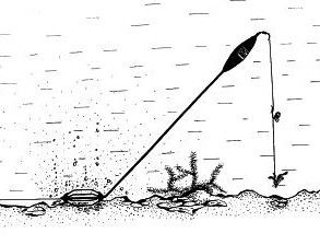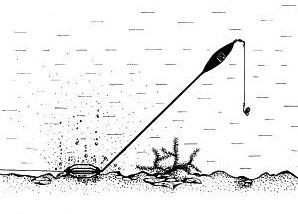 Dank des Auftriebs des Posenkörpers stellt sich die Tauchpose in einem Winkel von ca. 45° ein. Der lange Stiel (30 cm) hebt den Haken an, der in der sich auflösenden Futterwolke schwebt. Die Montage sinkt auch auf schlammigem Grund nicht ein. Die Montage wird einfach von der Seite des Rippenkorbs an der Hauptschnur befestigt.