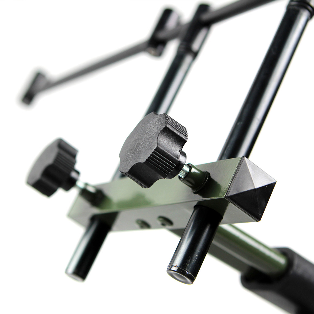 Der Rahmen ist in zwei Richtungen verlängerbar, was die perfekte Platzierung der Ruten erleichtert. Das vierbeinige feste System ist sehr stabil und macht den Ständer völlig spielfrei. Die Höhe der Querträger ist ebenfalls mit den großen Einstellschrauben verstellbar. Wir haben ihn mit einer dicken UV-beständigen Farbschicht versehen, die ihn lange vor den schädlichen Auswirkungen des Wetters schützt. Er wird in einer strapazierfähigen Tragetasche geliefert.