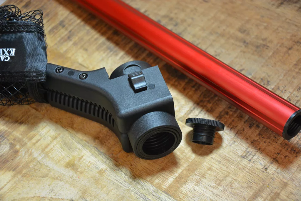Dieser faltbare Kescher lässt sich bis zu 165 Zentimeter ausziehen, seine Transportlänge beträgt 90 Zentimeter. Der Kopf lässt sich mit einem Handgriff öffnen und hat ein gummiertes Netz, dessen Maße 70x55x60 Zentimeter betragen. Der gummierte Griff am Ende des robusten Metallstiels sorgt für einen rutschfesten Halt, sodass wir selbst die größten Planktonfresser sicher keschern können.