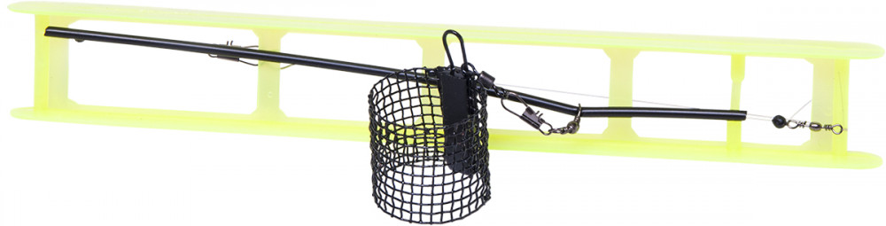 Vorgebundene Montagen waren aufgrund ihrer Praktikabilität schon immer beliebte Accessoires für Angler. Die vorliegende Ausführung ist eine auf einer Leiterspule angebotene Feeder-Endmontage, die mit einem runden Feeder-Korb ausgestattet ist. Man muss sie nur an die Hauptschnur binden und die Montage kann ins Wasser. Der runde Korb wird für langsam fließende Flüsse oder stehende Gewässer empfohlen.