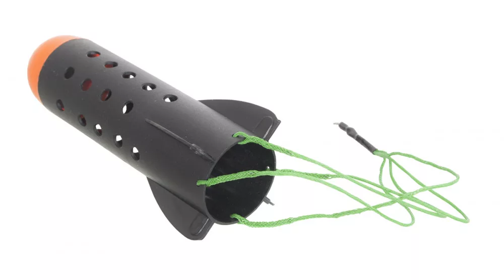 Wenn wir keine Möglichkeit zur Fütterung vom Boot aus haben, müssen wir eine vom Ufer aus nutzbare Fütterungsmethode finden. Die gebräuchlichste Methode ist das Schleudern, aber mit einer Futterrakete können auch größere Mengen Futter (bis zu 30-40 dag) über Distanzen von 100-120 Metern transportiert werden. Die Rakete wird mit einem Wirbel befestigt und kippt beim Aufprall auf das Wasser um, wodurch das Futter freigesetzt wird. Durch die Löcher in der Rakete fließt das Wasser ab, sodass sie leicht herausgezogen werden kann. Für die Verwendung ist eine Rute mit ausreichender Stärke (3,30-3,60m) und einem Wurfgewicht von mindestens 150g erforderlich. Mit der Rakete kann nahezu jedes Futter eingebracht werden: Mais, Weizen, Boilies, Pellets usw..