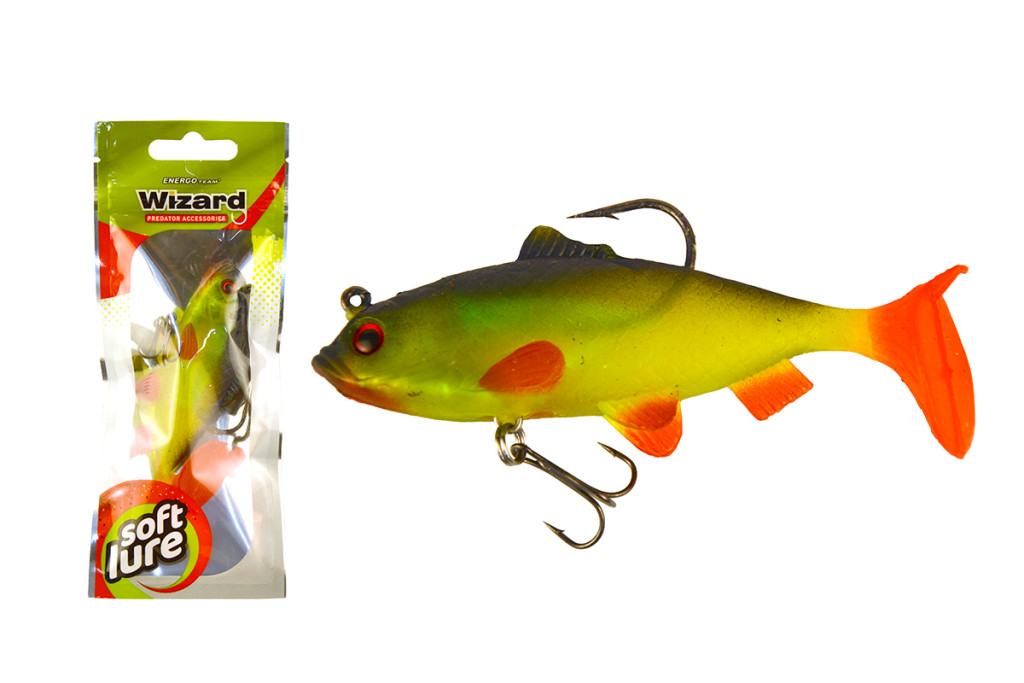 Der Packungsinhalt: 1 Stück Wizard Swimbait Perch 10,16cm Green Yellow Gummifisch