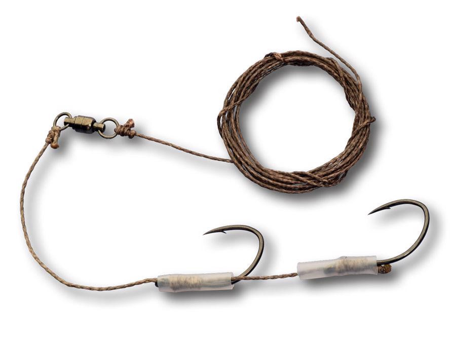 Das Vorfach ist mit zwei extrem scharfen und starken 5/0 Haken ausgestattet, die auch bei den aggressivsten Bissen sicher halten.
