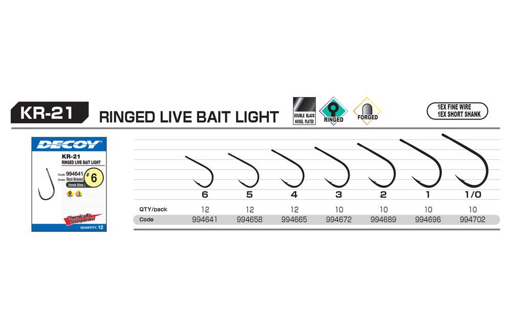 Die Marke Decoy ist seit langem für ihre hochwertigen Haken bekannt, und die KR-21 Serie ist keine Ausnahme. Der Round Live Bait Light Haken ist extrem langlebig und aus starkem Stahl gefertigt, der der Kraft der größten Raubfische standhält, während er seine Schärfe und Korrosionsbeständigkeit behält. Diese Zuverlässigkeit ist unerlässlich, um große Fänge zu sichern.