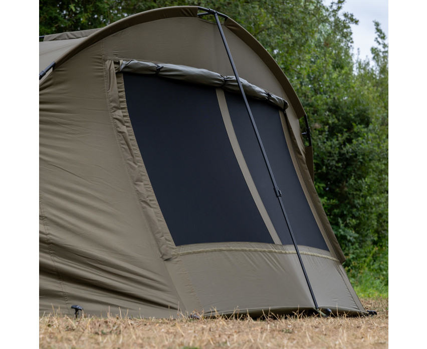 Die Zeltkonstruktion verfügt über zwei Versteifungsrippen und ein flaches Heck, ein sogenanntes „Kinderwagen“-Design, das durch ein großes, erweitertes Vordach ergänzt wird. Diese Form bietet nicht nur Stabilität, sondern auch erhöhten Schutz bei Regen, Wind oder starker Sonneneinstrahlung. Der vordere Bereich kann zurückgerollt werden, wodurch das Zelt in eine offene Veranda verwandelt wird. Die beidseitig von oben zu öffnende Tür verfügt über ein integriertes Moskitonetz und ein PVC-Fenster, das gleichzeitig Belüftung, Sicht und Insektenschutz bietet.