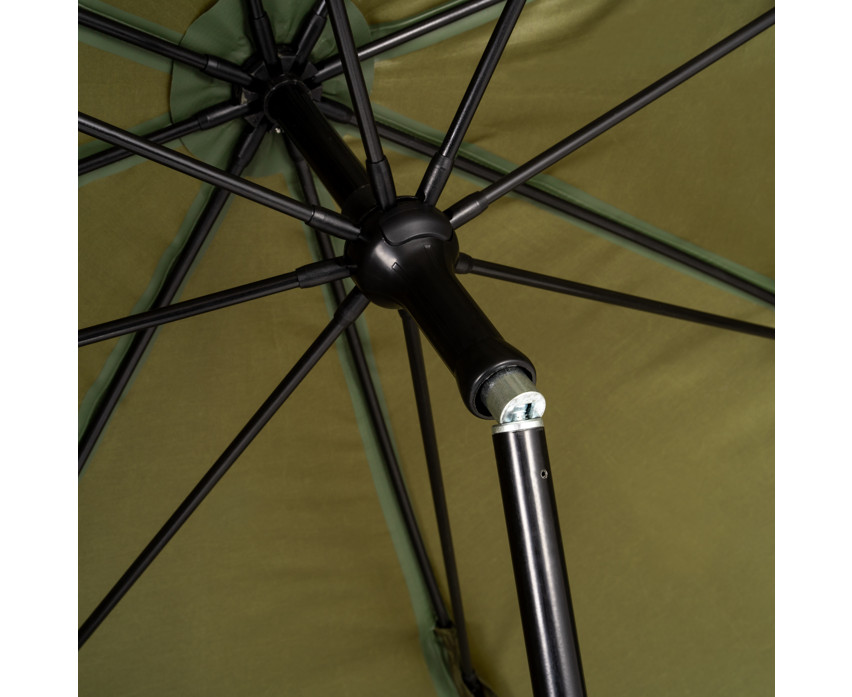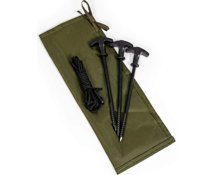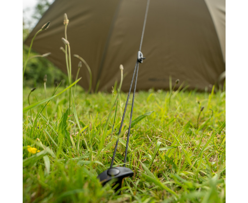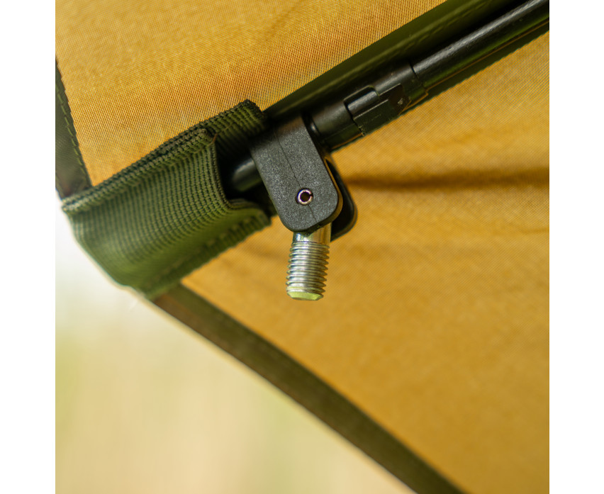 Zum Brolly gehören eine Spannleine, Befestigungshaken sowie zwei hintere Befestigungspunkte, die auch unter extremen Bedingungen für noch mehr Stabilität sorgen. Dank der vorbereiteten Befestigungspunkte für seitliche Stützstangen kann der Schirm weiter erweitert werden (die Stangen sind nicht im Lieferumfang enthalten). All dies basiert auf einem leichten, aber massiven Glasfaserrahmen mit einem Gesamtgewicht von nur 3,7 kg, so dass er leicht in der mitgelieferten Nylon-Aufbewahrungstasche transportiert werden kann.