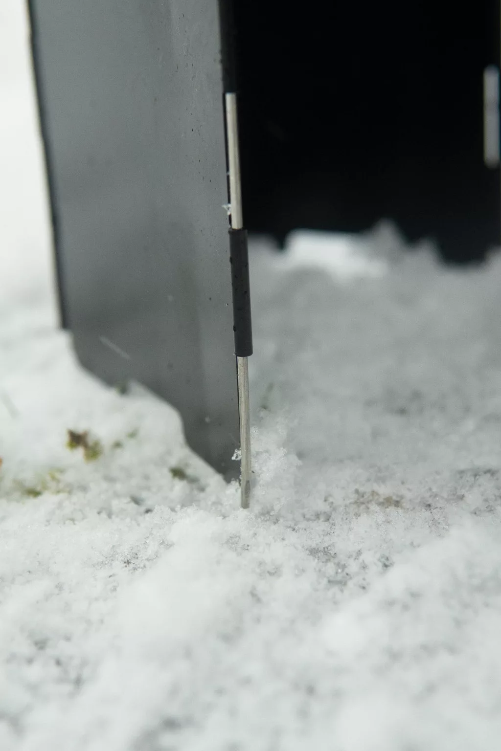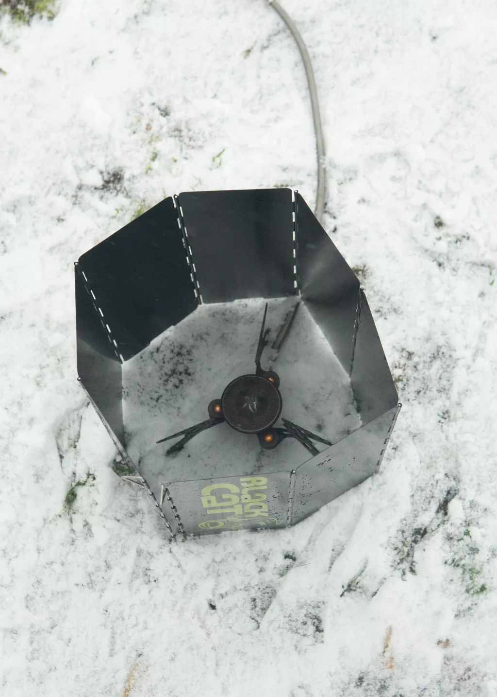 Der Windschutz hat ein siebenteiliges Design, das flexibel an verschiedene Herdgrößen angepasst werden kann. Die Paneele sind leicht beweglich, sodass die Form der Konstruktion an die Gegebenheiten angepasst werden kann. Die stabile Befestigung wird durch Erdspieße unterstützt, die auch auf weicherem Untergrund zuverlässigen Halt bieten, sodass der Wind den Schutzschild nicht verschieben kann.
