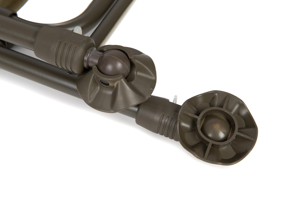 Der Fox EOS Standard Stuhl lässt sich leicht zusammenklappen, was den Transport und die Lagerung erleichtert. Alle vier Beine sind vollständig verstellbar, sodass der Stuhl leicht an jede Geländeform angepasst werden kann. Die drehbaren Schlammfüße an jedem Bein sorgen für Stabilität auf unebenem, weichem oder nassem Boden, was besonders wichtig beim Angeln ist, wenn das Ufer oft rutschig oder sumpfig ist.