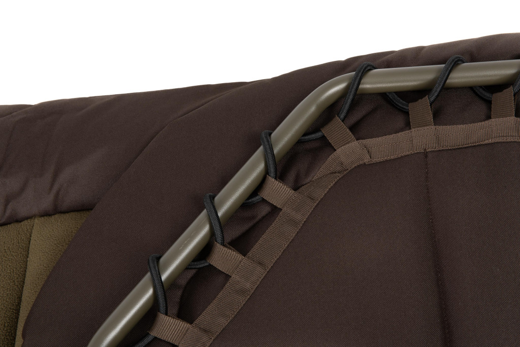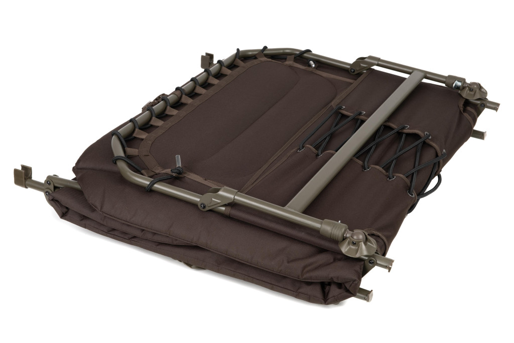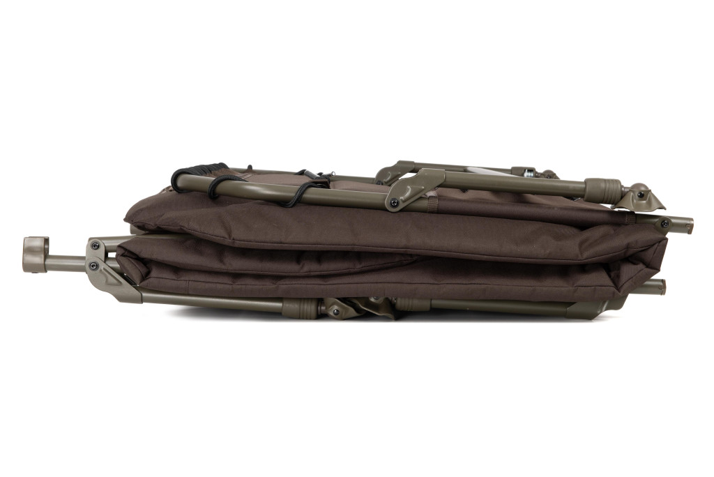 Die Angelliege ist in einer Kombination aus Khaki und dunklem Khaki gehalten, die ein natürliches Erscheinungsbild bietet und gut in die Umgebung des Zeltes oder des Ufers passt. Das knickfreie Design bietet eine größere nutzbare Breite, wodurch die Liegefläche geräumiger und bequemer ist als bei herkömmlichen Lösungen. Das flache Rahmendesign und die gepolsterte Schaumstoffmatratze sorgen für maximalen Komfort, selbst wenn Sie mehrere Nächte am Wasser verbringen.