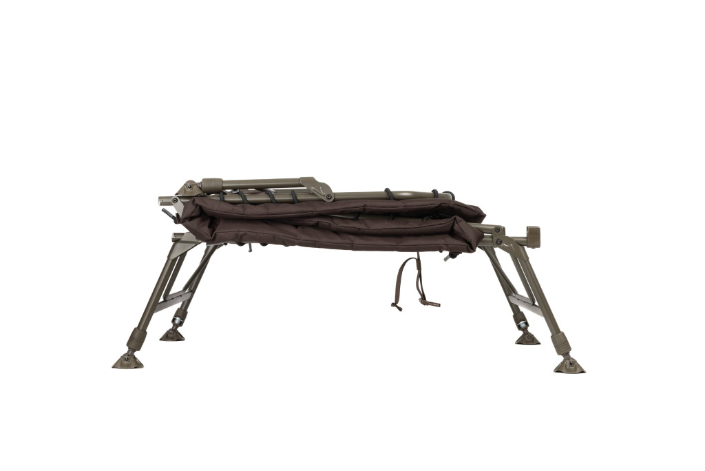 Die Stabilität wird durch sechs ausziehbare Beine mit drehbaren Schlammfüßen gewährleistet. Diese Füße passen sich hervorragend unebenem Gelände an, so dass das Bett auch auf weichem Boden, Kies oder nassem Ufer stabil bleibt. Das Gurt- und Schnallensystem ermöglicht ein kompaktes Zusammenklappen des Bettes, auch zusammen mit einem Schlafsack, was den Transport und die Lagerung erheblich erleichtert.