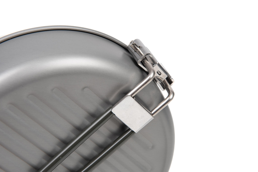 Die Töpfe und Pfannen verfügen über robuste, klappbare Griffe, die eine sichere Handhabung und kompakte Lagerung ermöglichen. Die Elemente des Sets sind ineinander stapelbar: Der Wasserkocher passt in den kleineren Topf, dann folgen der größere Topf und schließlich die Pfanne, was eine extrem platzsparende Lösung bietet. Das gesamte Set ist in einem Netz-Aufbewahrungsbeutel mit Kordelzug erhältlich, der den Transport erleichtert und die Kochutensilien schützt.