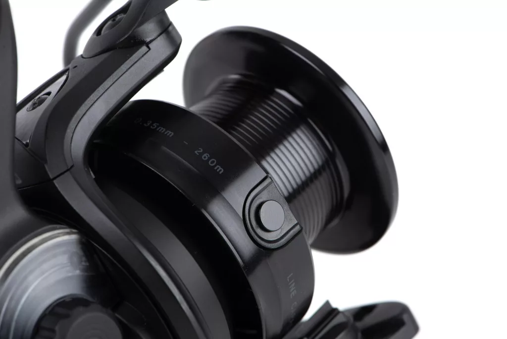 Das 10000er Modell ist in seiner Bauweise robust, aber ausgewogen und passt mit seinem Gewicht von 473 Gramm gut zu den meisten 3,6 oder 3,9 Meter langen Karpfenruten. Die Innenkonstruktion erhielt fünf Kugellager und ein Rollenlager, was in Verbindung mit einer Übersetzung von 4,9:1 einen reibungslosen, gleichmäßigen Lauf gewährleistet. Die Schnurkapazität der Spule beträgt 300 Meter bei 0,35 Millimeter Monofil, sodass dieser Typ ausreichend Reserven für weitere Würfe und für Fische, die dynamischer kämpfen, bietet.