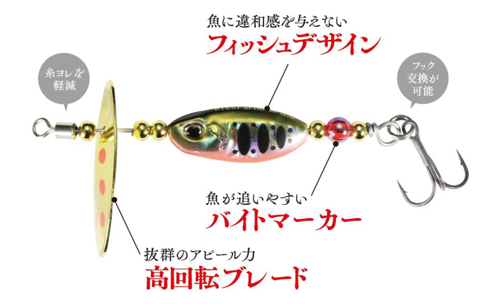 Ausgestattet mit einem „Köder“-Körper, der weite Würfe ermöglicht! Ein universeller japanischer Spinner, der sowohl in stehenden Gewässern als auch in starker Strömung eingesetzt werden kann.