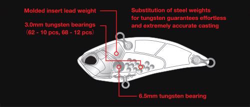 Die festen Stahlkugeln (6,5 mm x 1) und die frei beweglichen Rasseln (3,0 mm x 12) wurden durch Wolframkugeln der gleichen Größe ersetzt. Zudem wurde ein geformtes Fixgewicht am Kopf des Köders hinzugefügt, wodurch das Gesamtgewicht im Vergleich zum Normalmodell um 5 g gestiegen ist.