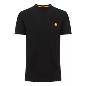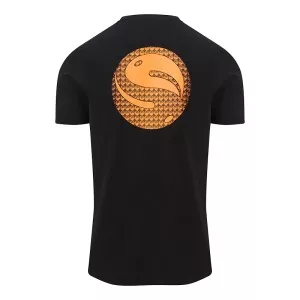 Leichtes, kurzärmeliges, schwarzes T-Shirt, vorne mit kleinem gesticktem orangefarbenem Guru Logo und hinten mit großem Guru Logo.