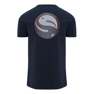 Leichtes, kurzärmeliges, dunkelblaues T-Shirt mit Guru-Schriftzug und Logo auf Vorder- und Rückseite.