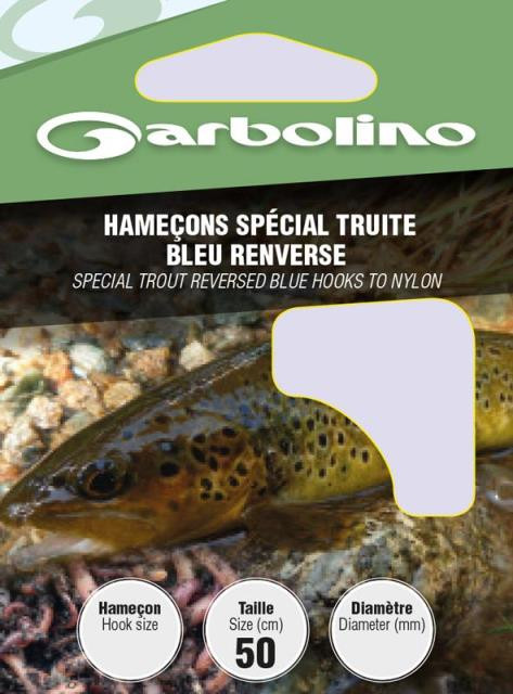 Garbolino Forellen-Blauhaken, rückwärtsgebogen, an Nylon 12 mit Plättchen, mit Widerhaken, Monofil vorgebunden, 10 Stk.