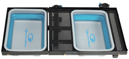 Die große Garbolino "BAC mit Aufbewahrungsbox" Seitenablage ohne Beine ist ein äußerst praktisches Kisten-Zubehör. Die neue Garbolino Ablage bringt eine wesentliche Neuerung mit sich, was im Wesentlichen bedeutet, dass genau zwei BAC-Futterboxen darin versenkt werden können. Dank des einzigartigen MULTIGRIP Halters der Ablage wird kein separates Bein benötigt, damit sie stabil steht. Durch die verschiedenen Einsätze passt sie perfekt zu den meisten Wettkampfkistenbeinen, insbesondere zu den Größen D25, D30 und D36. Die auf dem Bild gezeigten zwei BAC-Boxen sind separat zur Ablage erhältlich und gehören nicht zum Standardzubehör.